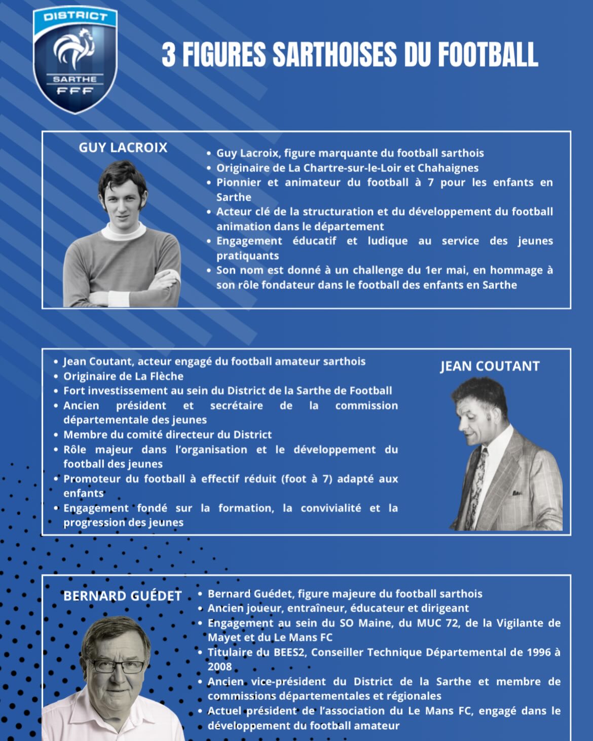 Le Challenge Coutant–Lacroix–Guedet doit aussi son succès à l’implication de nombreux acteurs locaux. Éducateurs, dirigeants, bénévoles et partenaires se mobilisent chaque année pour assurer le bon déroulement des rassemblements U10 et U11 dans les secteurs de Foot Animation. Merci à tous de leur engagement et dévouement. Leur engagement témoigne de la vitalité du football amateur sarthois et de son rôle essentiel dans l’animation du territoire.