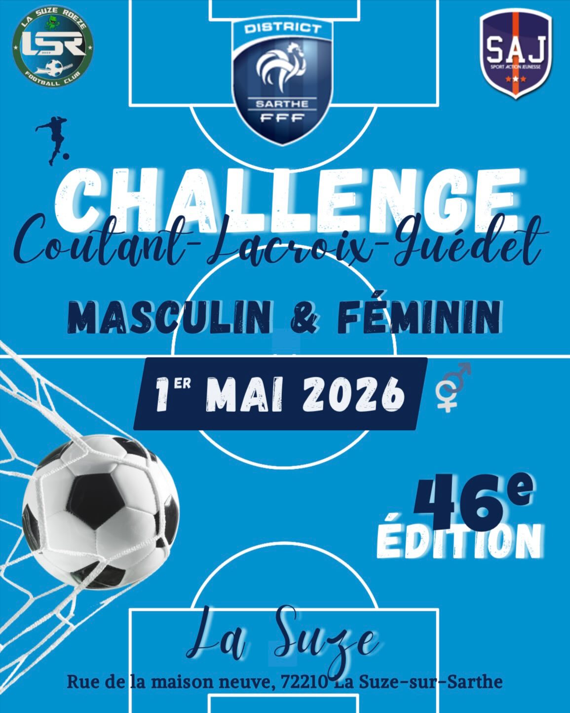 Alors, que vous soyez parents, amis, passionnés de football ou simples curieux, nous vous attendons nombreux à La Suze sur Sarthe ce vendredi 1er mai pour encourager les futures pépites du football sarthois ! Venez vivre une journée pleine d’émotions et de belles actions sur le terrain.