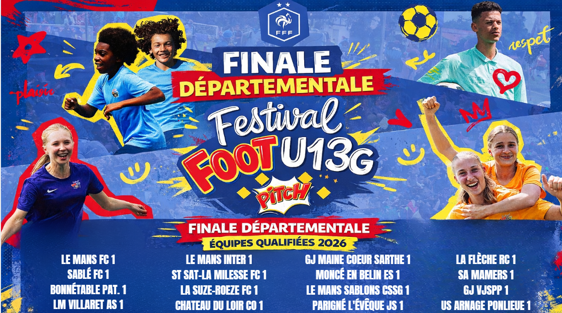 La finale départementale du Festival Foot U13G et U13F Pitch se déroulera à Coulaines le samedi 28 mars 2026.