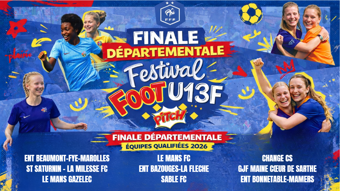 La finale départementale du Festival Foot U13G et U13F Pitch se déroulera à Coulaines le samedi 28 mars 2026.